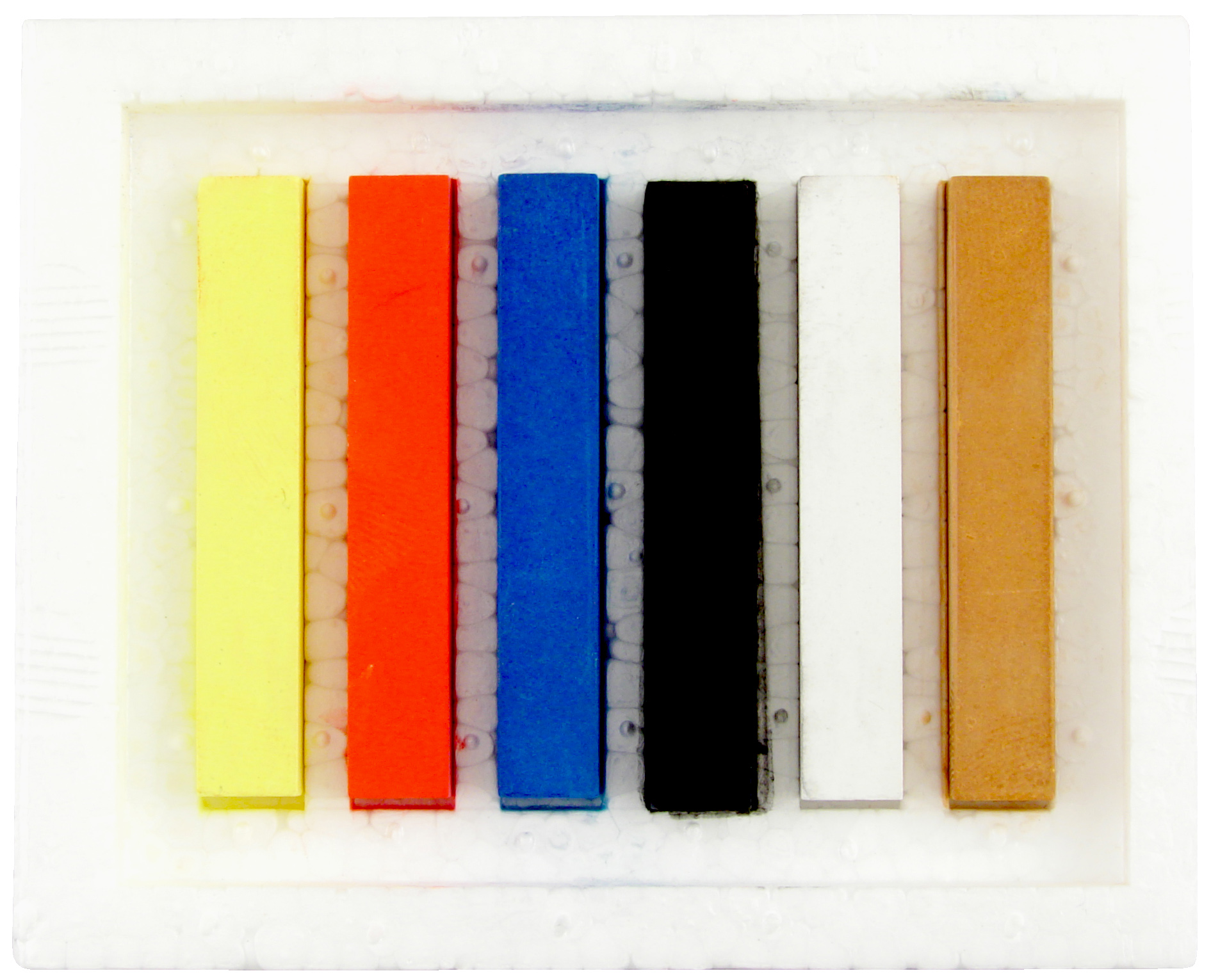 Vermilion, Yellow, Blue, Black, White, & Yellow Ochre.
